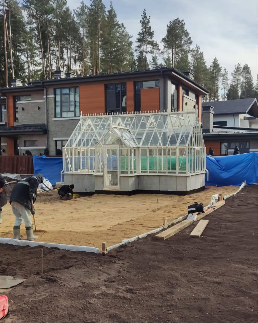 Эта теплица ВИНДЗОР построена нами за два дня с опережением других работ по отделке, благоустройству и наполнению теплицы грядками.