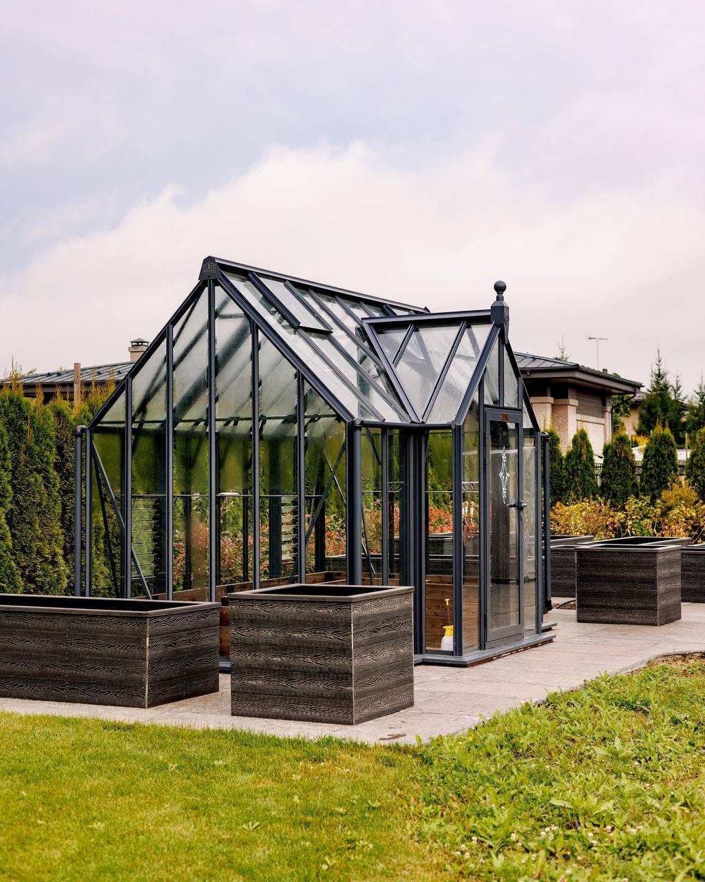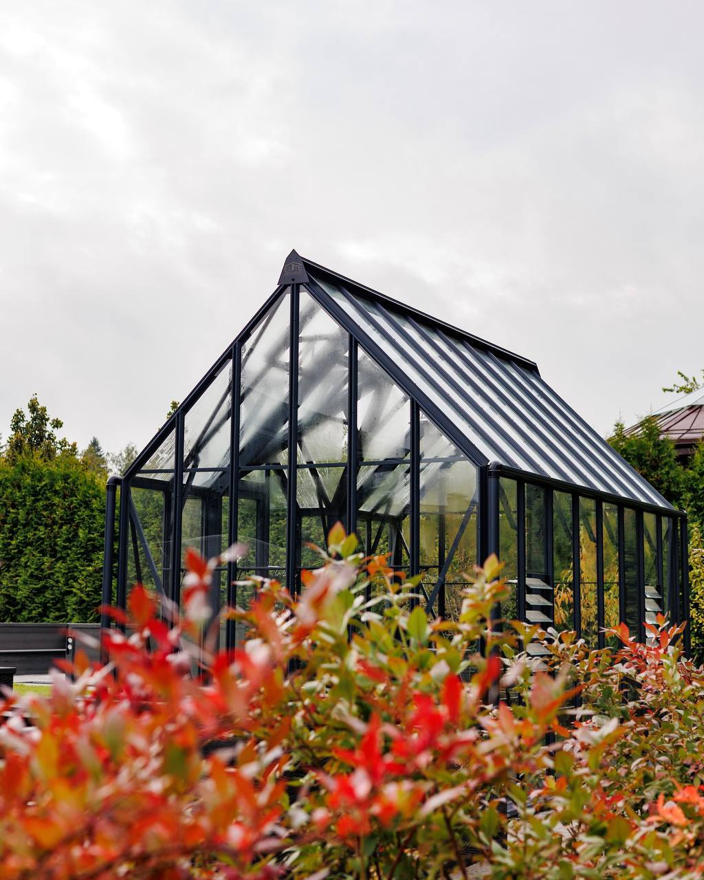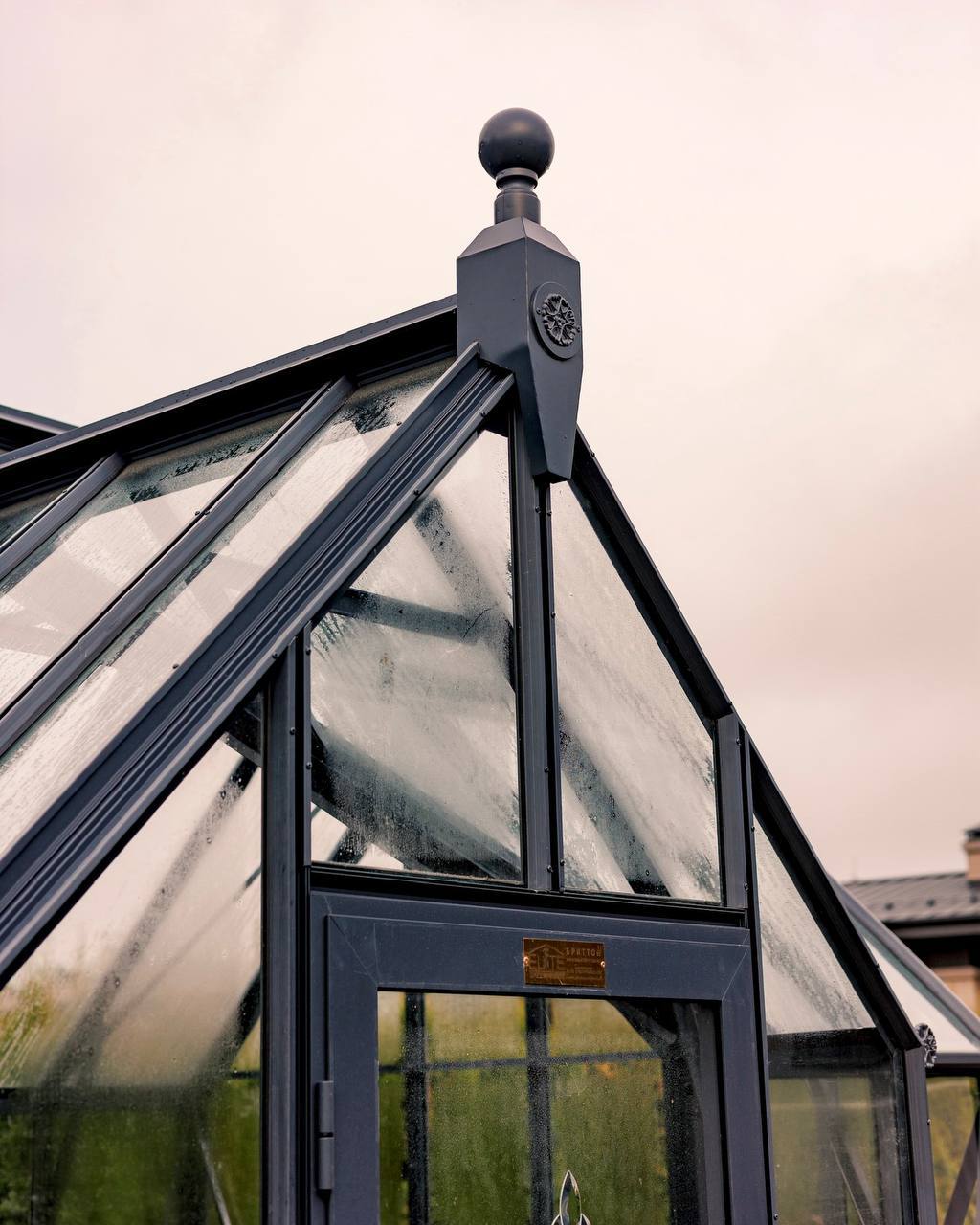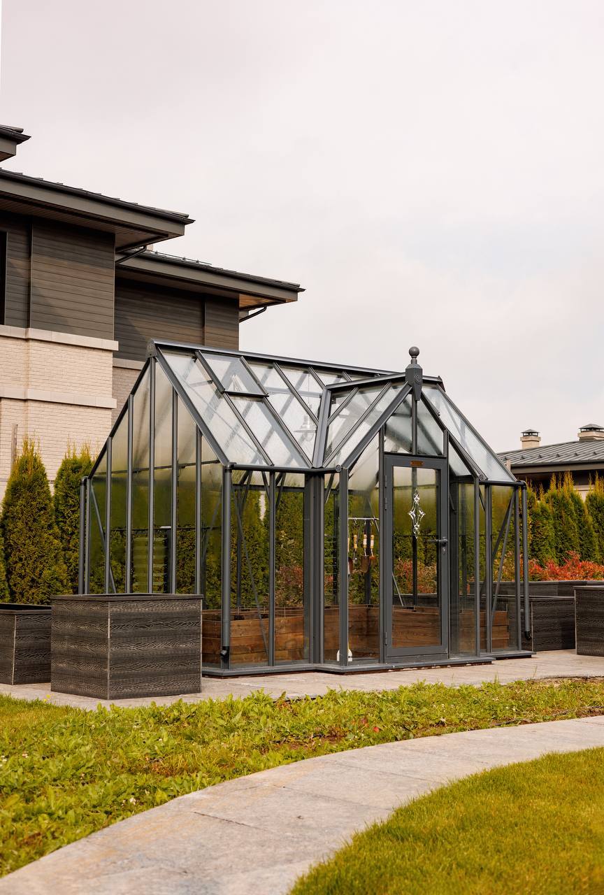 Стараясь соответствовать окружающей архитектуре, иногда делаем теплицы без викторианского декора в цветовой гамме рядом стоящих построек.