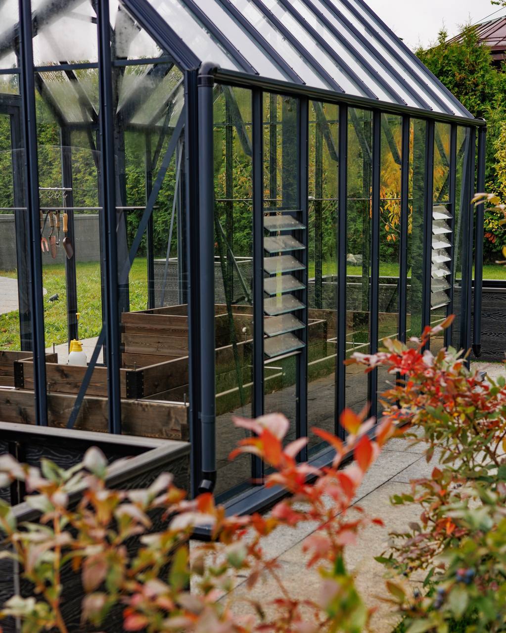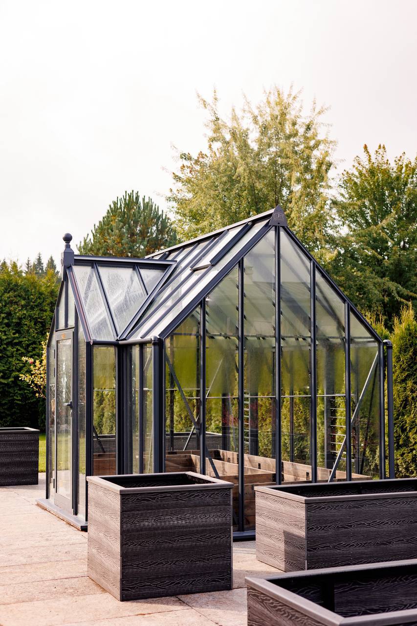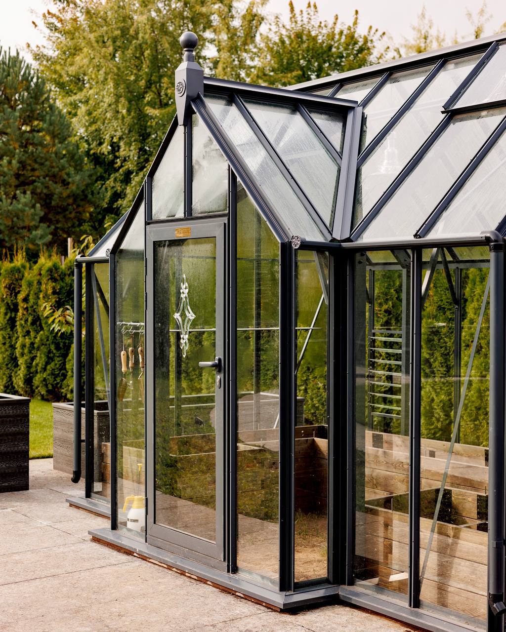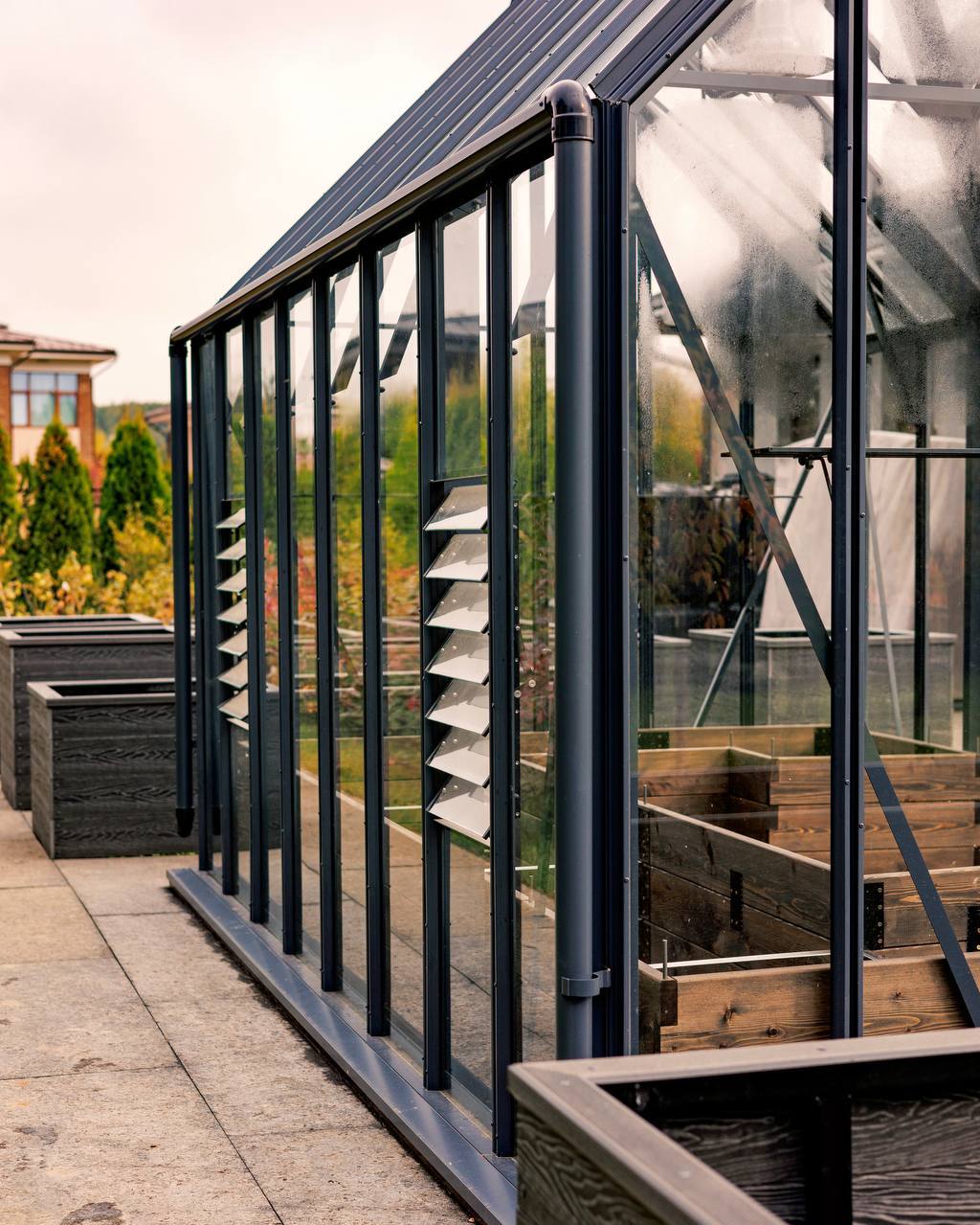 Стараясь соответствовать окружающей архитектуре, иногда делаем теплицы без викторианского декора в цветовой гамме рядом стоящих построек.
