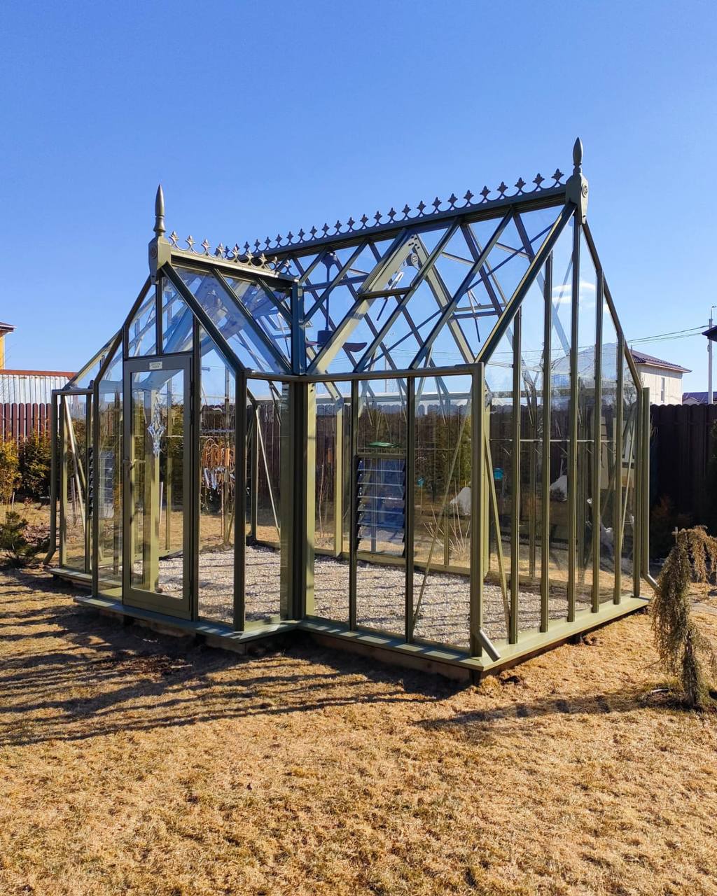 Эту оливковую теплицу ЧЕСТЕР мы сделали месяц назад, а сейчас помогаем заказчице подготовить основание под установку грядок, которые ей будут делать наши партнёры зюиз компании ЭкоДеко.